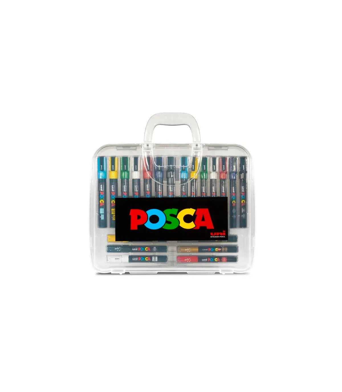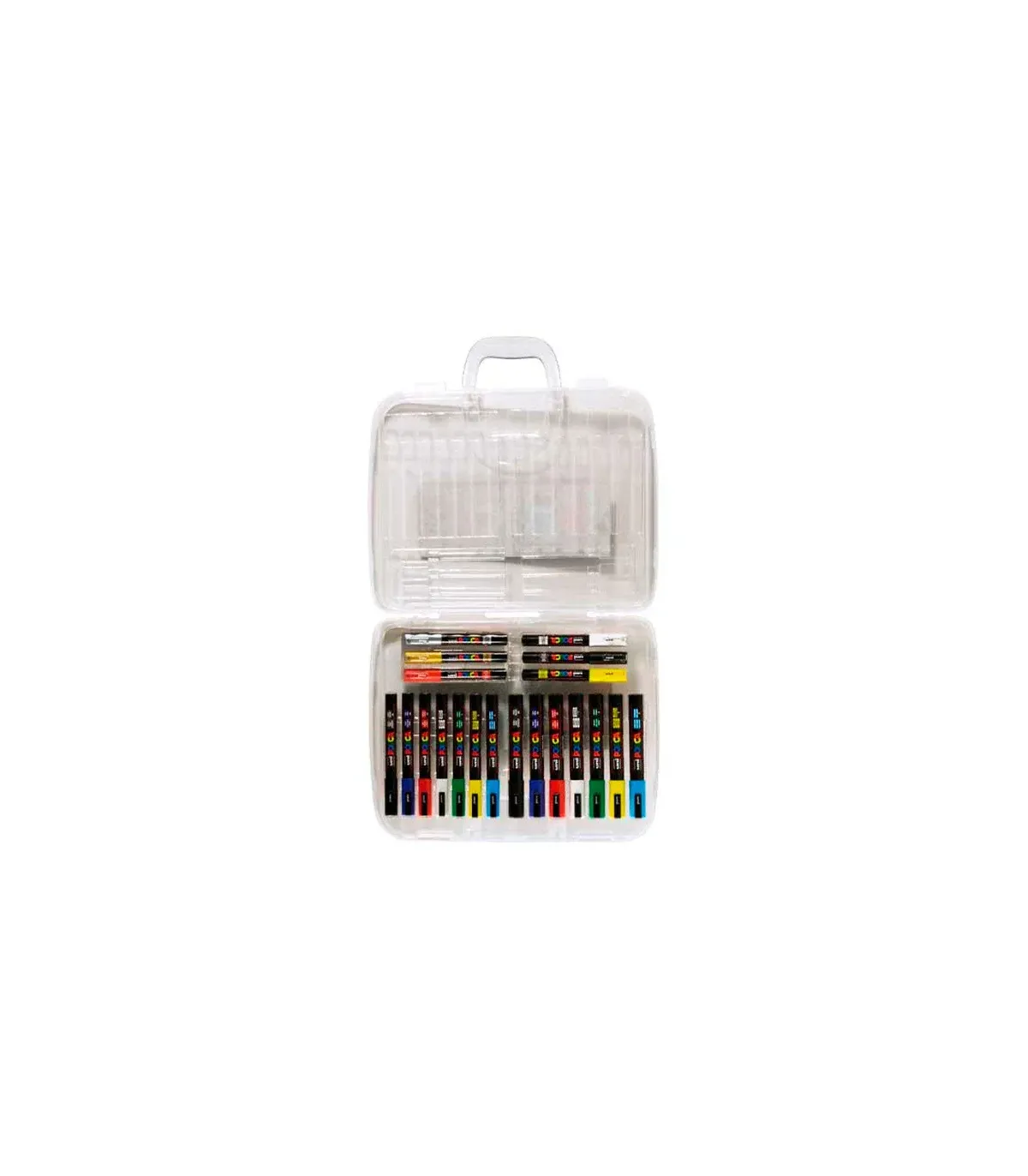 Maletín rígido y transparente de poliéster que incluye 20 rotuladores Posca, ideales para diseño, rotulación, cartelería, decoración y manualidades.