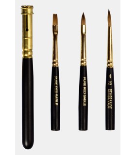 Set de viaje con 3 pinceles de pelo natural de marta roja pura, ideales para acuarela. Incluye un mango alargador intercambiable.