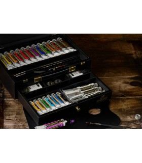 Cofre-Maletín. Caja de Madera con 2 pisos, el inferior se abre a modo de cajón. Surtida con un total de 24 tubos de oleo Rembrandt (10 tubos de 15ml, 12 tubos de 40ml, 2 tubos de 60ml), auxiliares y accesorios.